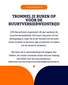 Activiteiten 2026 Buurtversieractie Vorig jaar kleurden de buurten van Bunschoten prachtig oranje tijdens de eerste…